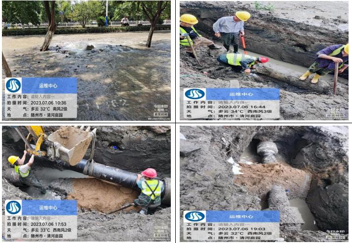 7月6日上午10點(diǎn)20分,客服人員接到群眾的熱線電話,告知清河路清河庭院附近路面大量跑水,運(yùn)維中心搶修人員接到消息迅速前往,十五分鐘到達(dá)現(xiàn)場,通過專業(yè)技能和判斷,確定為DN400主管道爆破,測漏人員立即協(xié)助精準(zhǔn)定位漏點(diǎn),盡量減少開挖面,為搶修爭取時(shí)間,該管道會直接影響周邊黃龍五隊(duì)、清河庭院、東方小區(qū)、楚苑小區(qū)、雙橋家具大市場等小區(qū)和企業(yè)大面積水小或停水。酷暑難耐,為盡快解決群眾用水問題,維修人員在35°高溫下連續(xù)奮戰(zhàn)8小時(shí),于當(dāng)晚7點(diǎn)30分恢復(fù)正常供水,及時(shí)避免了周邊居民下班后正常生活用水的問題。