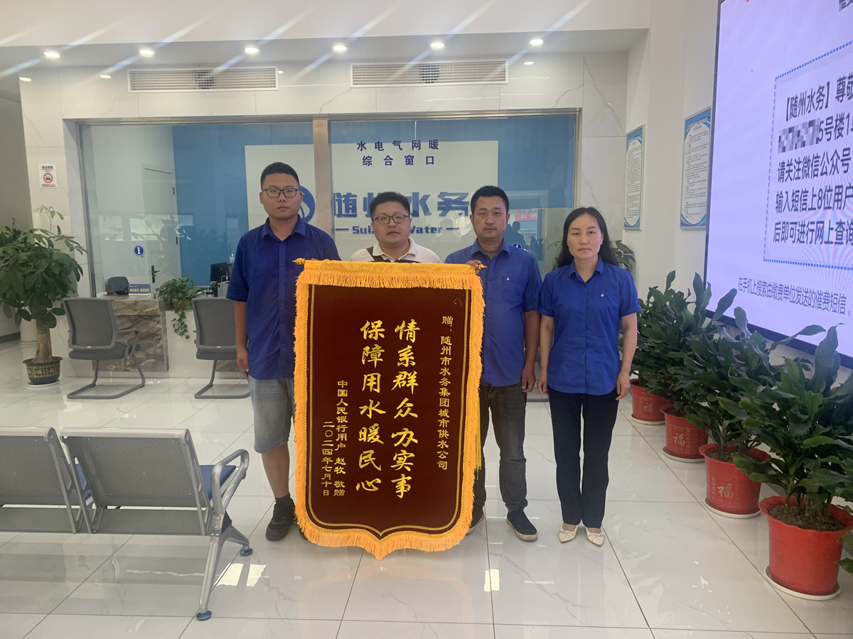 近日,中國人民銀行用戶將一面繡有“情系群眾辦實(shí)事  保障用水暖民心”的錦旗送到隨州市水務(wù)集團(tuán)城市供水公司共享營業(yè)廳。感謝運(yùn)維中心維修人員急用戶之所急、憂用戶之所憂、真心為用戶考慮,解決其用水問題。