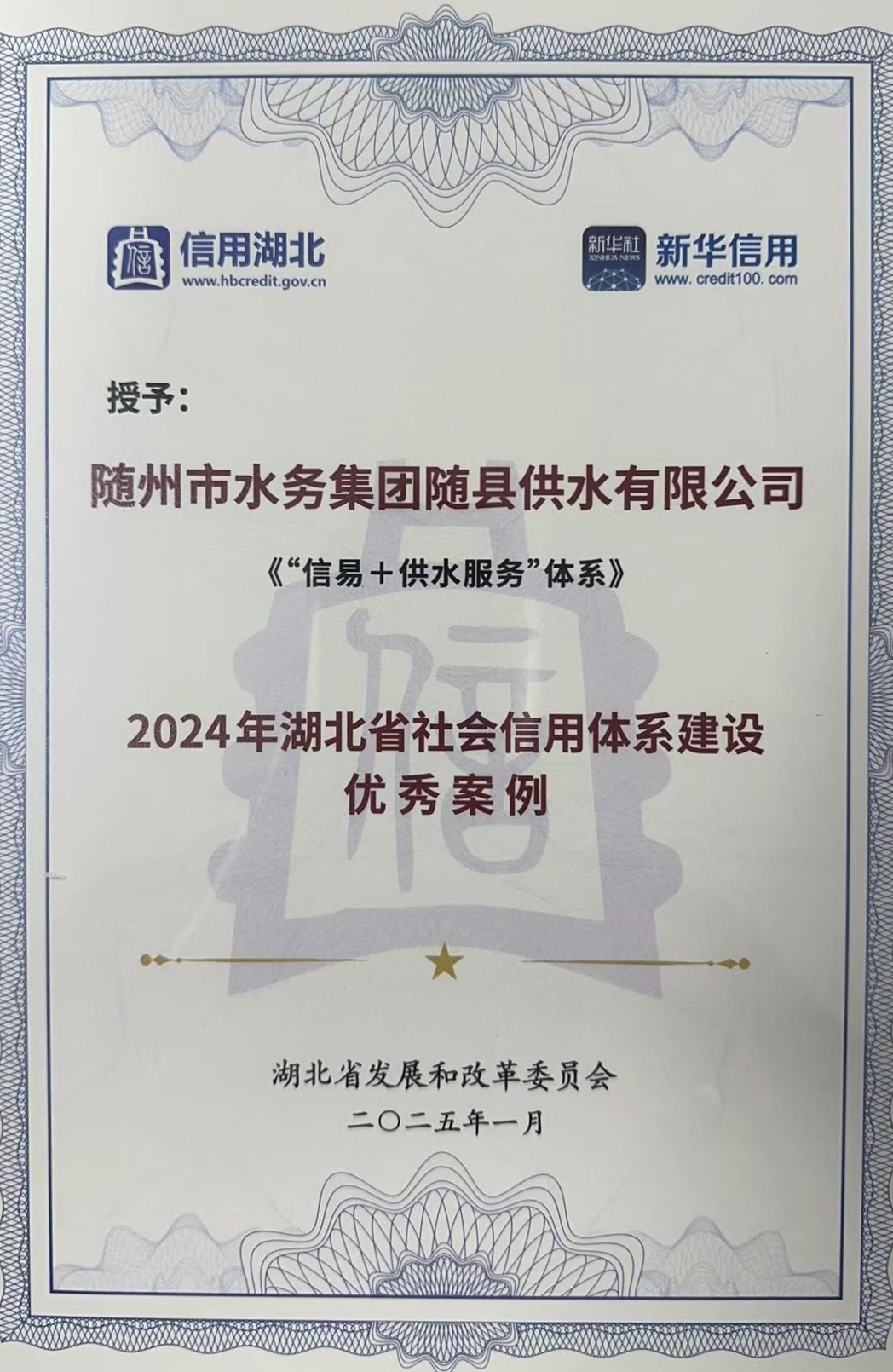 在2024年湖北省社會信用體系建設典型案例評選中,隨州市水務集團有限公司憑借創(chuàng)新實踐項目《“信易+供水服務”體系》,成功榮膺全省優(yōu)秀案例獎。這一殊榮既是對隨州水務集團創(chuàng)新服務成效的認可,更是為社會信用建設和營商環(huán)境優(yōu)化注入強勁動能,進一步激活創(chuàng)新發(fā)展新勢能。