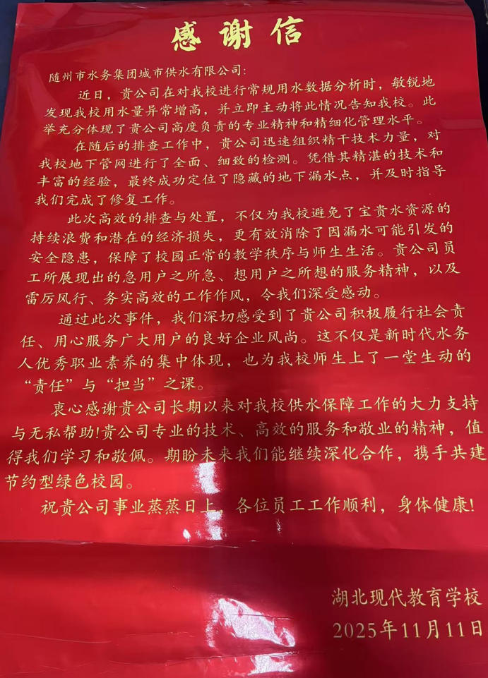 一面鐫刻著明察秋毫堵漏點,傾心服務暖師生”的鮮紅錦旗,隨同滿載深情的感謝信,被湖北現(xiàn)代教育學校負責人鄭重送到隨州市水務集團城市供水公司。紙短情長,字里行間飽含對公司快速解決校園供水困境的誠摯謝意